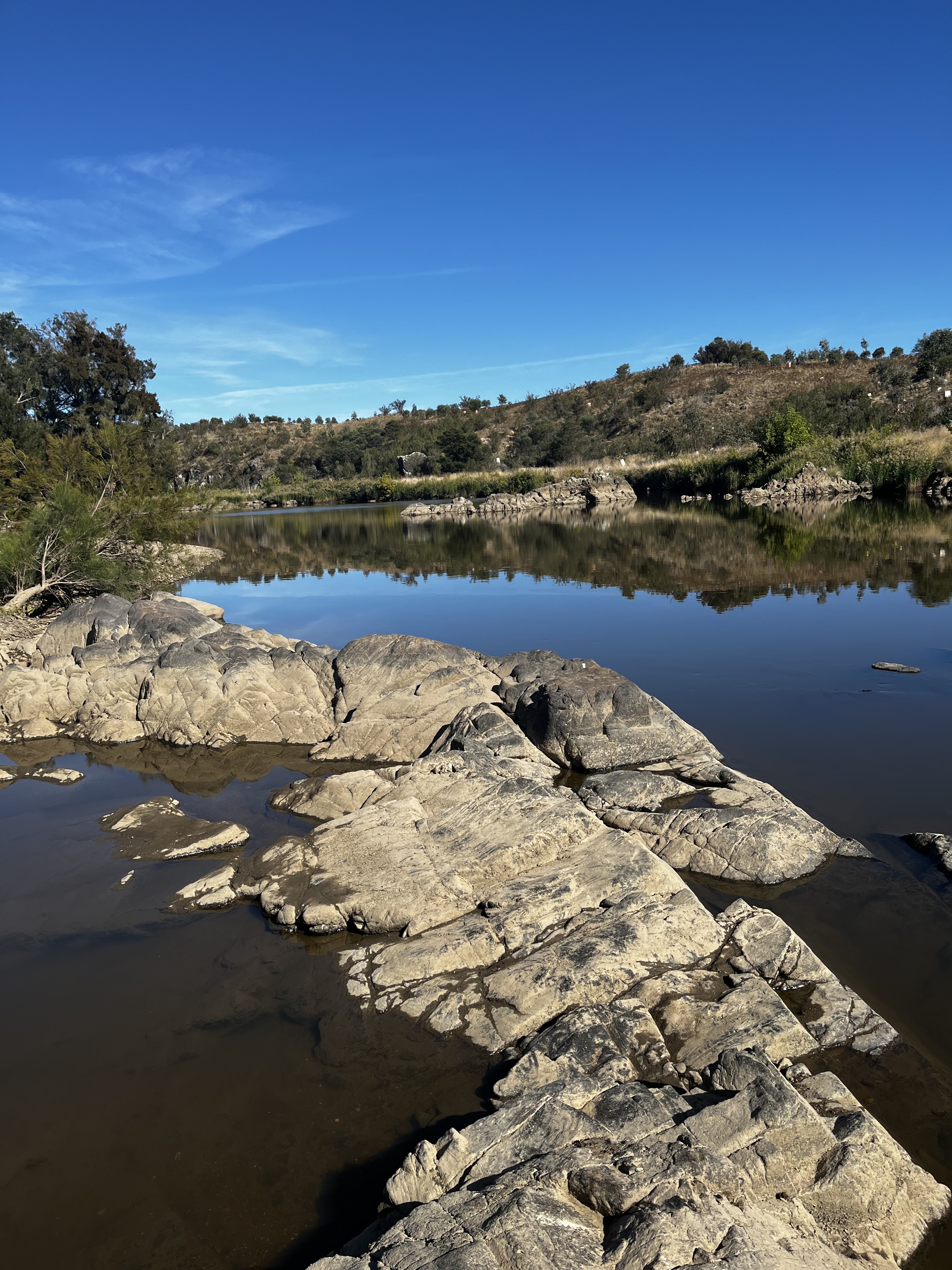 It was very hot at the weekend (mid-thirties), so I went for walks early and in relatively cool places, near water. On Saturday I explored the Molonglo River Reserve with its quiet banks and rocky outcrops. The name Molonglo derives from the Ngunnawal clan known as the Moolongoolah, and the word Molonglo itself is derived from an Aboriginal word meaning 'like the sound of thunder'. There was no hint of thunder today.